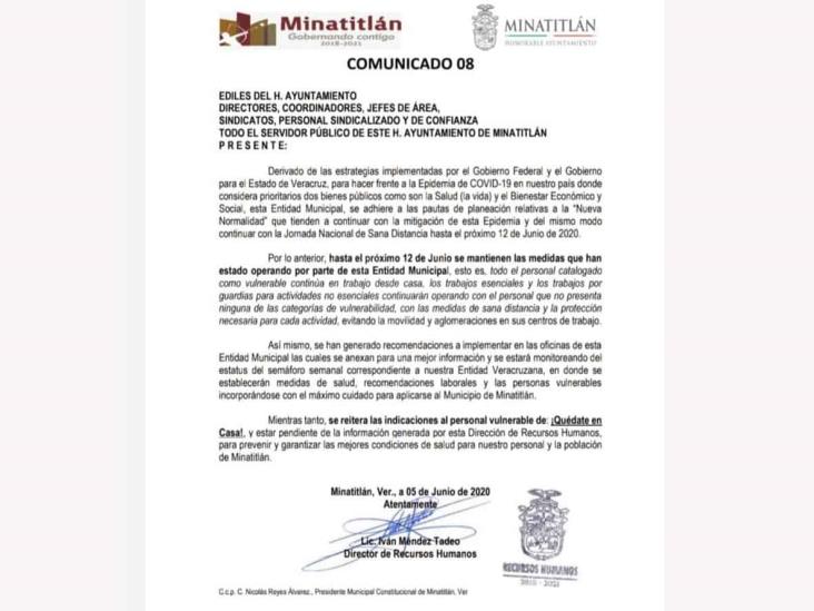 De acuerdo al ´comunicado 08´ con fecha 5 de junio y firmado por Méndez Tadeo, dirigido a ediles, directores, coordinadores, jefes de área, sindicatos, personal sindicalizado y de confianza, se integrarán a la ´Nueva Normalidad´ a partir del 12 de junio, por lo que el personal catalogado vulnerable hará trabajo en casa, mientras que las actividades no esenciales se realizarán con personal que no presenta estos problemas, aplicando medidas preventivas y de sana distancia.